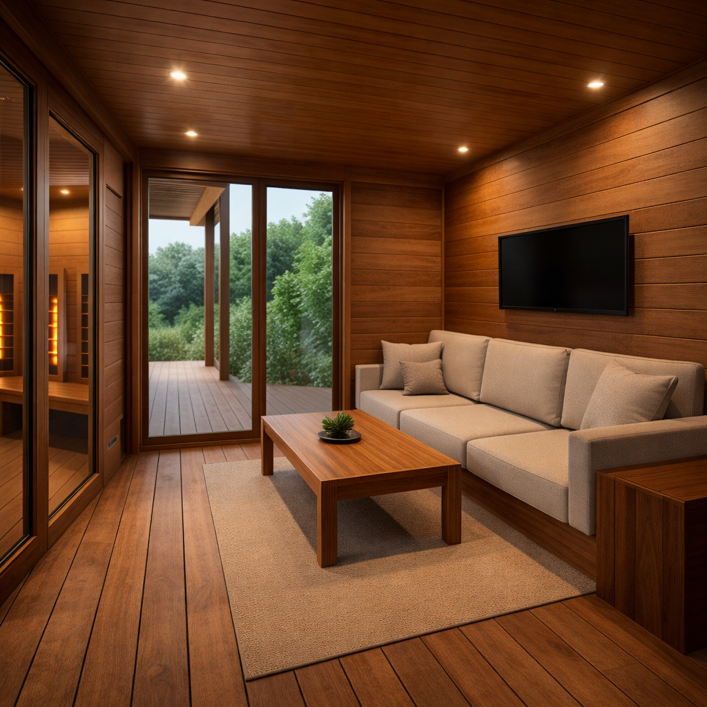 Le sauna infrarouge Outdoor Premium Walnut est un sauna extérieur spacieux conçu pour accueillir jusqu’à 6 personnes. Réalisé en bois de noyer naturel, il s’installe sur une terrasse ou une véranda et intègre deux zones distinctes : une cabine infrarouge et un espace détente avec canapé, table et télévision. Les panneaux infrarouges assurent une chaleur douce et homogène, sans vapeur ni poêle traditionnel, tandis que les surfaces vitrées mettent en valeur son design premium et son intégration dans l’environnement extérieur.